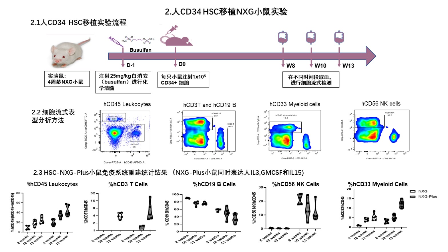 品系描述:Prkdc基因功能缺失導致V(D)J重組不能正常發(fā)生,造成T細胞和B細胞不能發(fā)育成熟,IL2Rg是多種白細胞介素細胞因子受體的共同亞基,IL2Rg失活則導致6種不同細胞因子信號通路缺失,造成NK細胞缺陷。NOD/Shilt遺傳背景使該品系具有天然免疫缺陷,如補體系統(tǒng)、巨噬細胞缺陷,因此,NXG是迄今為止免疫系統(tǒng)缺陷最為徹底的小鼠模型之一。
